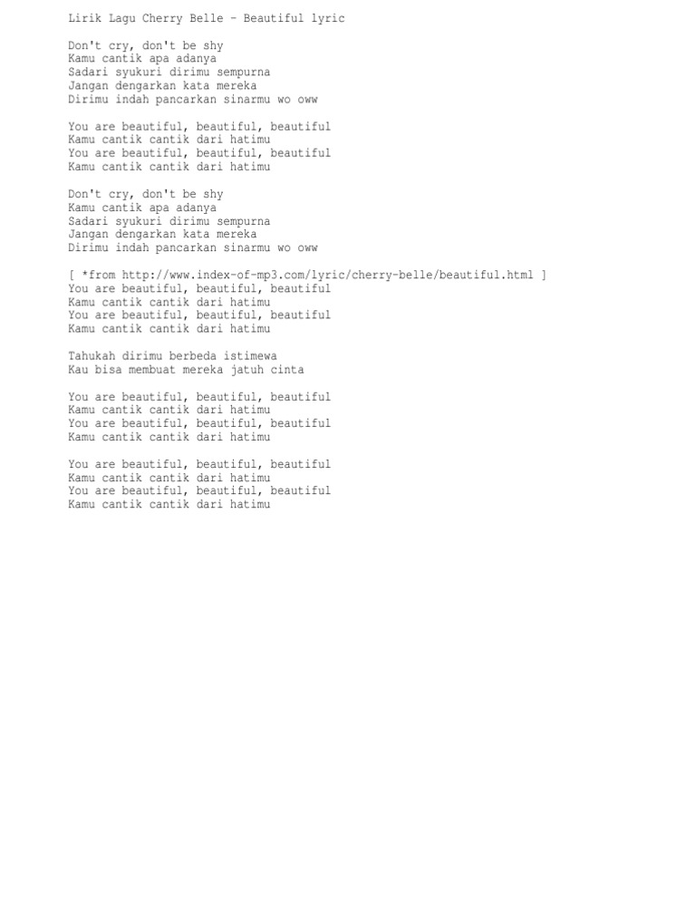 You Are Beautiful Lyrics Cherrybelle . Ketikkan nama penyanyi dan judul lagu, berikan tanda kutip di judul lagu, misal: You are beautiful not just because your eyes are although i know that's true, my love you're beautiful because you're you you are beautiful not just because your smile is although that's plain to see, my love you're beautiful because you smile at me and when i need a friend someone to pull me through you are everything that i can believe